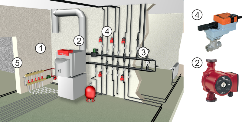СИСТЕМИ ОПАЛЕННЯ КОТЕДЖУ, ОФІСУ, МАГАЗИНУДля опалення в житлових приміщеннях, як правило, використовуються три наступні основні типи систем:1. Радіаторне опалення; 2. Теплі підлоги; 3. Повітряне опалення В системі опалення опалення нагріта вода від джерела тепла (індивідуального котла) (1) по системі трубопроводів (2) подається в радіатори (3) та/або в теплі підлоги (4). Залежно від способу циркуляції води системи опалення бувають із природною або примусовою циркуляцією. У системі з природною циркуляцією циркуляція води забезпечується за рахунок різниці частки гарячої та холодної води. Такі системи опалення мають обмежений радіус дії через невеликий циркуляційний тиск і вимагають більше часу на запуск у роботу. Також для отримання максимального ККД цієї системи доводиться використовувати труби великого діаметру. Основною перевагою цих систем опалення є незалежність від електропостачання. ![]() Для забезпечення теплом зараз все частіше використовують навісні конденсаційні газові опалювальні котли, наприклад, VITODENS німецької фірми VIESSMANN. Vitodens – це газовий конденсаційний котел. настінного виконання з оптимальним співвідношенням ціна/продуктивність, високим комфортом опалення та приготування гарячої води, компактними габаритними розмірами та класичним елегантним дизайном. Vitodens витрачає меншу кількість енергії, оскільки він додатково використовує приховану теплоту пароутворення у газах. Результат: коефіцієнт корисної дії котла Vitodens 200-W дорівнює 98% (Hs)/109% (Hi). За допомогою Vitodens Ви знижуєте власні витрати на опалення та дбаєте про чистоту навколишнього середовища. Серцем Vitodens 200-W є циліндричний пальник із високоякісної нержавіючої сталі. Вона є особливо економічною, оскільки використовує модуляційний принцип горіння. Водночас значно скорочуються емісії шкідливих викидів. Таким чином, Vitodens 200-W відповідає найвищим вимогам охорони навколишнього середовища. Завдяки компактним розмірам Vitodens 200-W підійде майже до будь-якого інтер'єру: на кухні, у ванній кімнаті, в окремому приміщенні. Vitodens 200-W швидко монтується та поставляється в готовому до експлуатації у вигляді. Неважливо, проектуєте його під нове будівництво або встановлюєте у вже існуюче приміщення. ![]() Для розведення системи опалення рекомендується використовувати металопластикові труби, наприклад TECEFlex РЕ-ХС-AL-РЕ (Німеччина). Завдяки тому, що спосіб виробництва TECEFlex заснований на використанні внутрішньої труби з поліетилену PE-Xc, полімерні труби TECEflex відрізняються особливою термостійкістю. Довгий термін служби гарантується навіть за високої температури. Білі металополімерні труби добре виглядають і на поверхні, і в магістральному розведенні. Обрізки та залишки можна використовувати в інших системах, наприклад, у трубопроводах питної води. ![]() Настінні радіатори – сталеві штамповані конвектори або литі алюмінієві. Зовнішній вигляд настінних радіаторів малюнку внизу. На кожен радіатор рекомендується встановлювати термостатичний вентиль і арматуру, що відключає. Це дозволить керувати опаленням у приміщенні, що суттєво знижує витрату теплової енергії та полегшить обслуговування та експлуатацію. ![]() Під вікнами та дверима можуть бути встановлені вбудовані конвектори, наприклад чеські MINIB. Ці моделі відрізняє висока продуктивність і збільшена тепловіддача завдяки оп