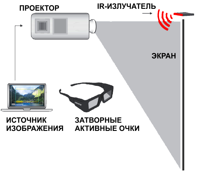 Технологія полягає в поперемінній демонстрації на екрані зображень, призначених для лівого і правого ока, а також почергове затемнення окулярів, так що кожне око по черзі бачить призначене тільки йому зображення. Зміна «лівого» і «правого» зображення на екрані і затемнення відповідного скла жорстко синхронізовані і здійснюються з дуже високою частотою, так що за рахунок ефекту інерції зору у людини створюється ілюзія, що вона бачить цільне тривимірне зображення. В даний час використовуються рідкокристалічні окуляри затвора, де використовуються РК-заслінки.