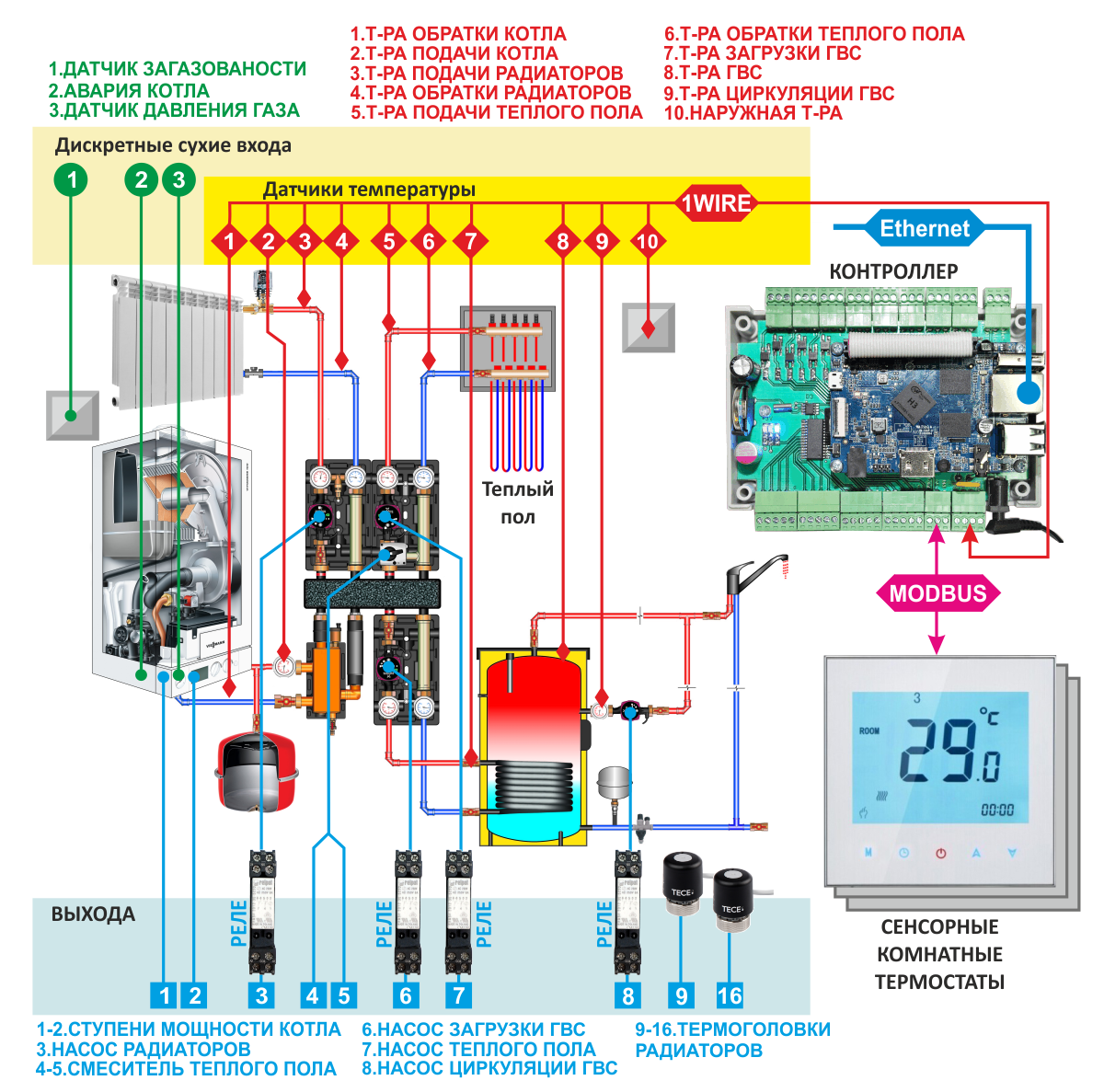 У кімнатах встановлюються недорогі сенсорні теромтстати BAC-1000, які з'єднуються з контролером по мережі ModBus. Для реєстрації температур використані датчики температури OneWire DS18B20. Управління виконавчими пристроями – через електромагнітні реле 12В. У контролері крім виконуючої програми є також і WEB-інтерфейс, який дозволяє дистанційно керувати системою опалення. Запис даних про роботу системи здійснюється на зовнішній USB-накопичувач у вигляді стандартної бази даних. Всі дані можна подивитися як через вбудований WEB-інтерфейс так і по мережі через інші програми для перегляду баз даних.