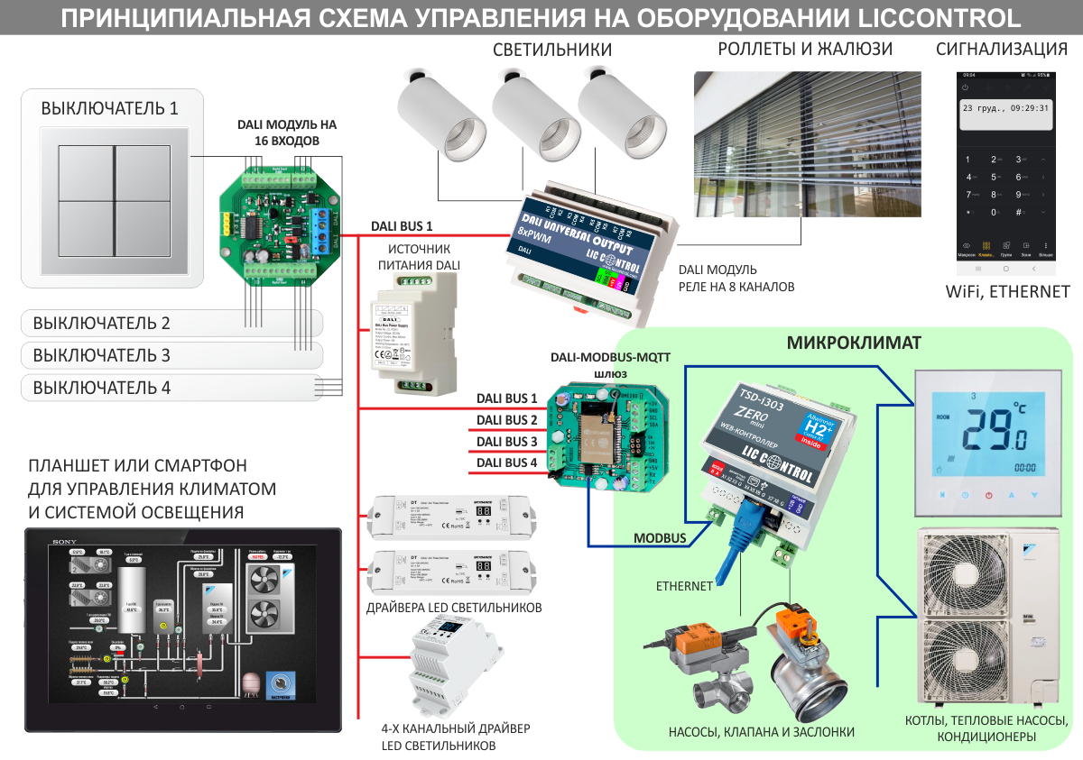 Автоматизація інженерних систем будівлі із застосуванням управління освітленням за протоколом DALI. Забезпечує недороге вирішення питання автоматизації керування великою кількістю груп освітлення будинку, офісу, магазину, промислового підприємства або складу з можливістю дистанційного контролю через Інтернет із комп'ютерів, планшетів або смартфонів. Може працювати з ОС Windows, Mac OS, Android, Linux. Враховуючи той факт, що більшість якісних драйверів сучасних LED світильників підтримують протокол DALI, цей варіант управління освітленням стає найзручнішим. Всі драйвери за допомогою протоколу DALI забезпечують димування LED світильників.