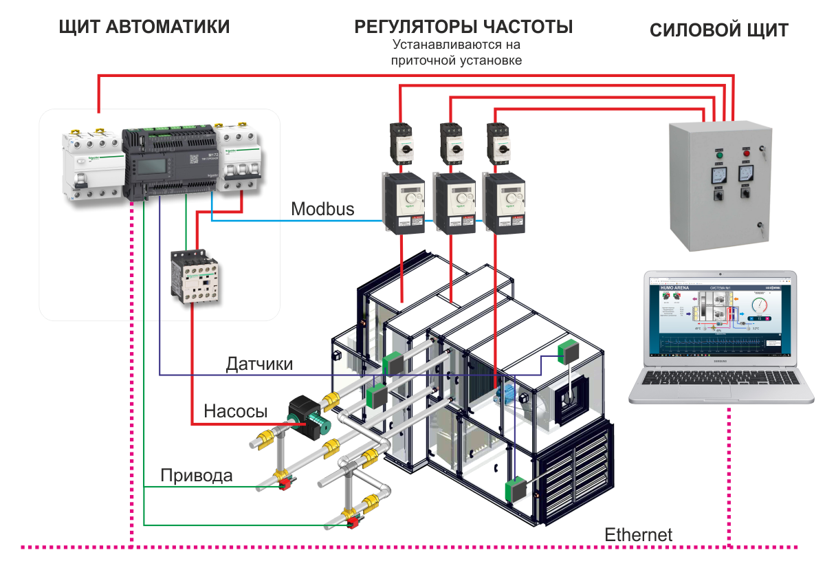 Принципова схема автоматики керування припливною установкою з роторним рекуператором на базі контролерів Modicon M172 та регуляторів частоти Altivar фірми Schneider Electric