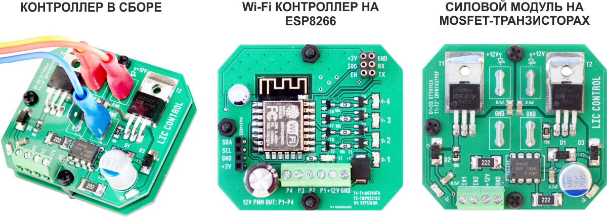 Включає Wi-Fi контролер на ESP8266 і силовий модуль на MOSFET транзисторах.