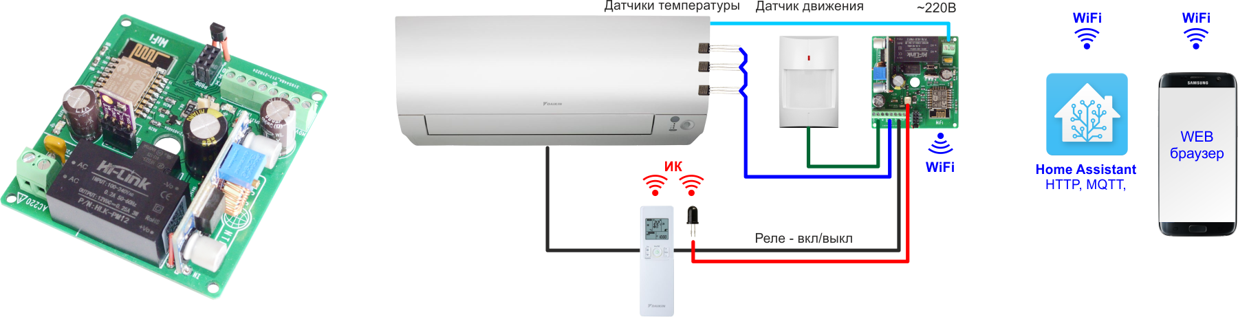 Модуль має свій WEB-інетрфейс і може з'єднуватися з іншими контролерами по HTTP та/або MQTT. Наприклад, може бути підключений Home Assistant через MQTT. Може бути використаний як недороге рішення задачі моніторингу та управління безліччю спліт кондиціонерів в офісному центрі або для контролю роботи сплітів у серверних кімнатах Також підходить для керування окремими спліт-кондиціонерами у квартирах чи будинках. Підтримує керування більшістю відомих кондиціонерів таких як DAIKIN, MITSUBISHI, SAMSUNG, HAIER, CHIGO, SONY, PANASONIC, FUJITSU, GREE, TOSHIBA, MIDEA, CARRIER, HITACHI та ін. Розмір плати модуля (ШхГхВ) 71х76х25 мм. Живлення ~220В. Задати питання, дізнатися ціну або залишити заявку ви можете через форму зворотнього зв'язку |
